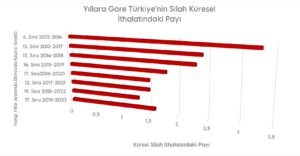 Türkiye, 2019-2023 yıllarında dünyanın en büyük 25 silah ihracatçısı arasında 11. sıraya yükseldi. 2014-2018 yılları arasında 14. sırada olan Türkiye önceki döneme göre %106’lık bir büyüme kat etti. Son 5 yıllık dönemde Türkiye’nin en büyük müşterileri ile BAE (%15), Katar (%13) ve Pakistan (%11)oldu. 2014-2018 yılları arasında küresel ihracat pazarının %0,6’sına sahip olan Türkiye buradaki payını %1,6’ya çıkardı.